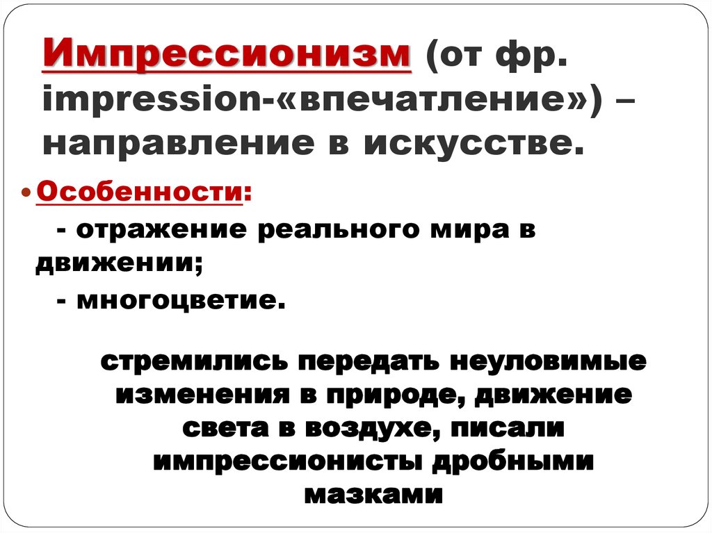 26. Импрессионизм (от фр. impression-«впечатление») – направление в искусстве.