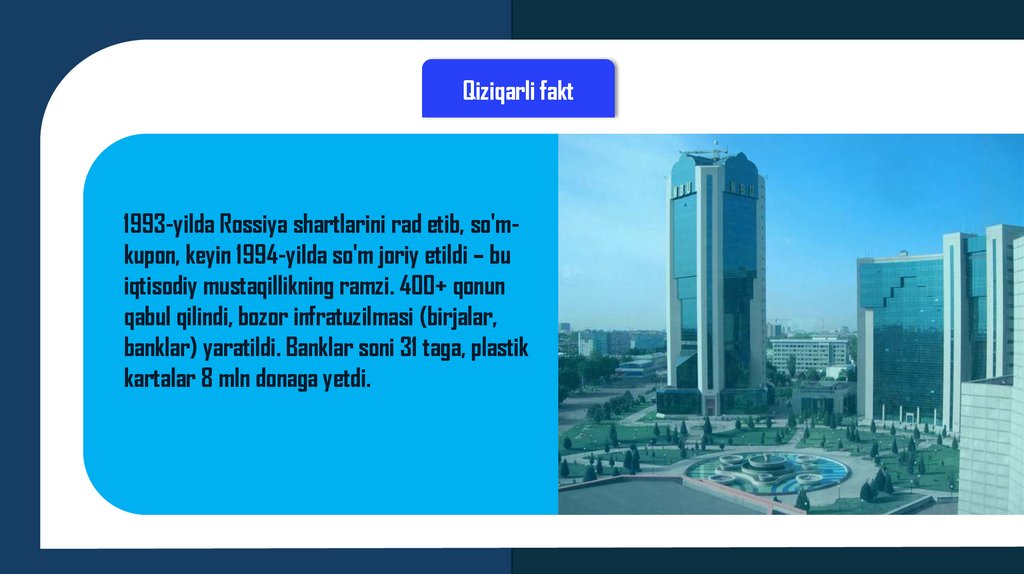 Qiziqarli fakt1993-yilda Rossiya shartlarini rad etib, so'mkupon, keyin 1994-yilda so'm joriy etildi – bu