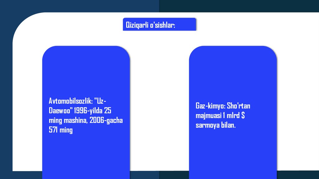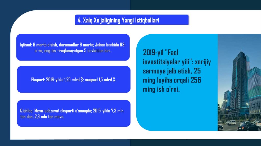 4. Xalq Xo'jaligining Yangi IstiqbollariIqtisod: 6 marta o'sish, daromadlar 9 marta; Jahon bankida 63o'rin, eng tez rivojlanayotgan 5 davlatdan biri.