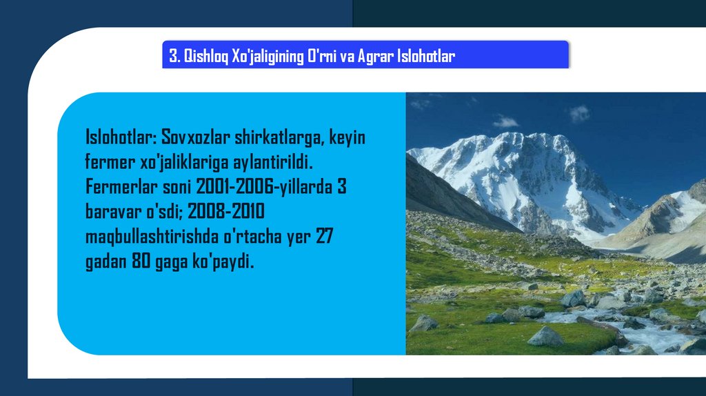 3. Qishloq Xo'jaligining O'rni va Agrar IslohotlarIslohotlar: Sovxozlar shirkatlarga, keyin