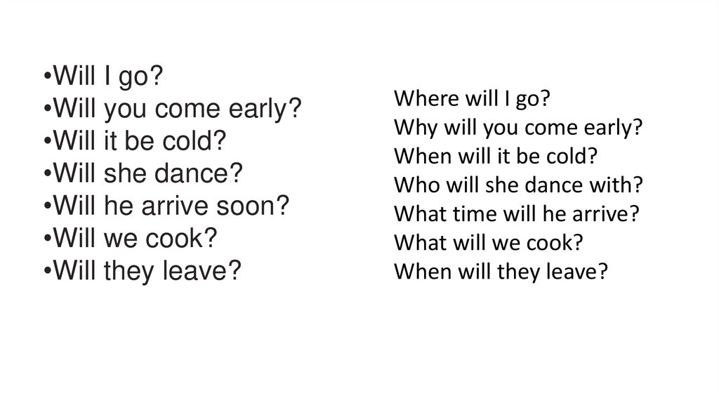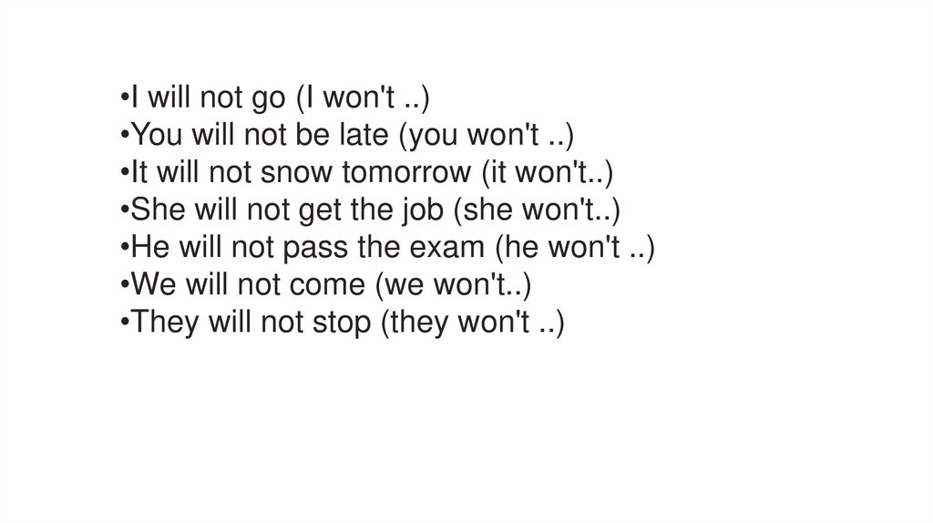 •I will not go (I won't ..)•You will not be late (you won't ..)