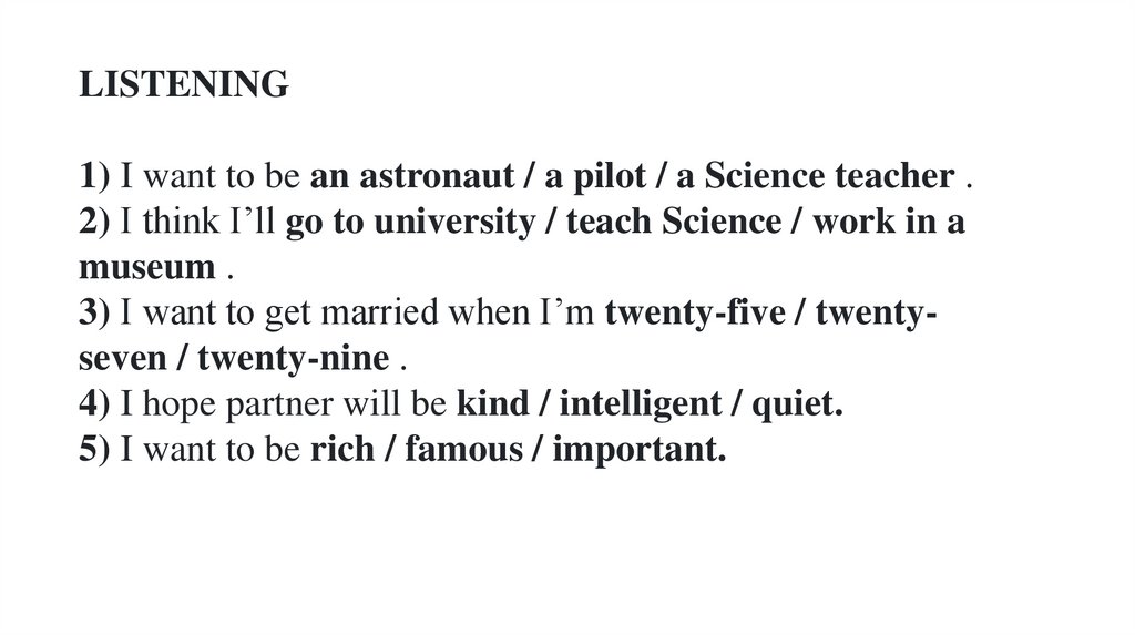 LISTENING1) I want to be an astronaut / a pilot / a Science teacher .