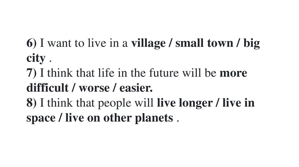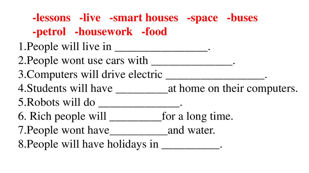 -lessons -live -smart houses -space -buses-petrol -housework -food