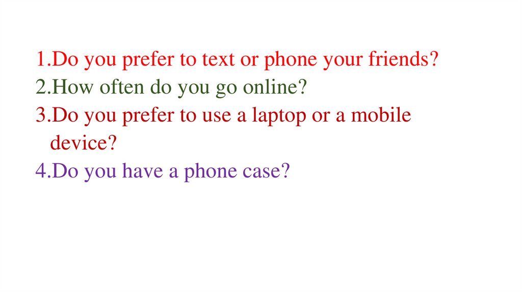 1.Do you prefer to text or phone your friends?2.How often do you go online?