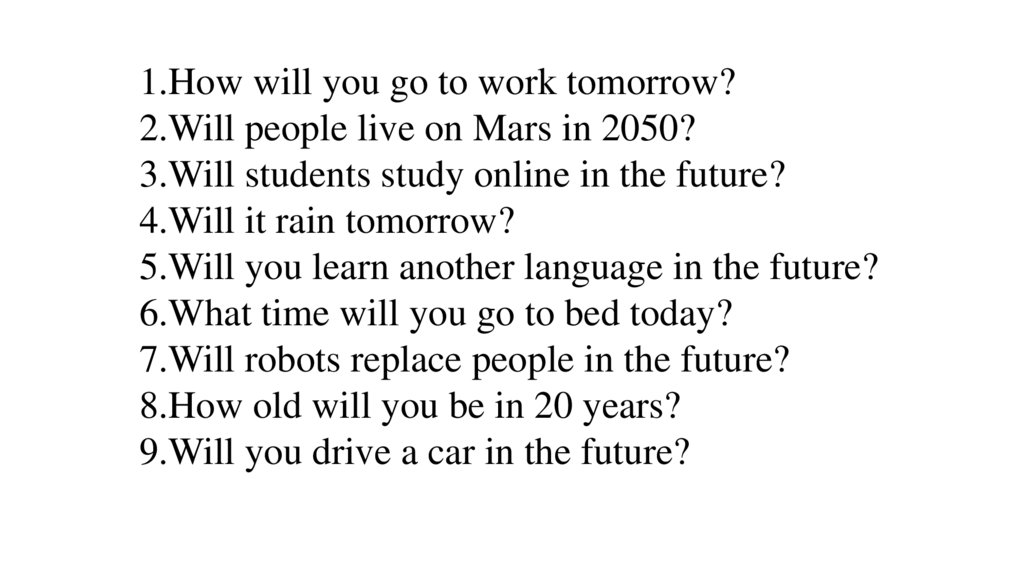 1.How will you go to work tomorrow?2.Will people live on Mars in 2050?
