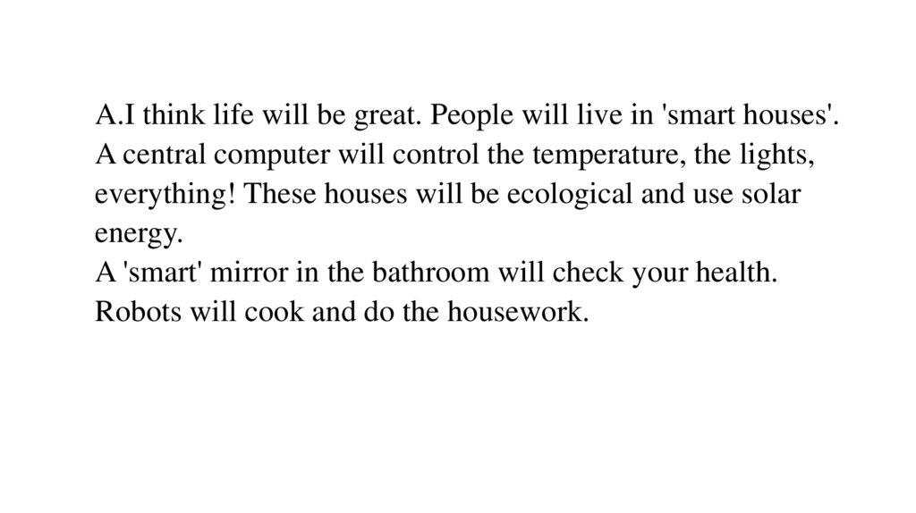 A.I think life will be great. People will live in 'smart houses'.A central computer will control the temperature, the lights,