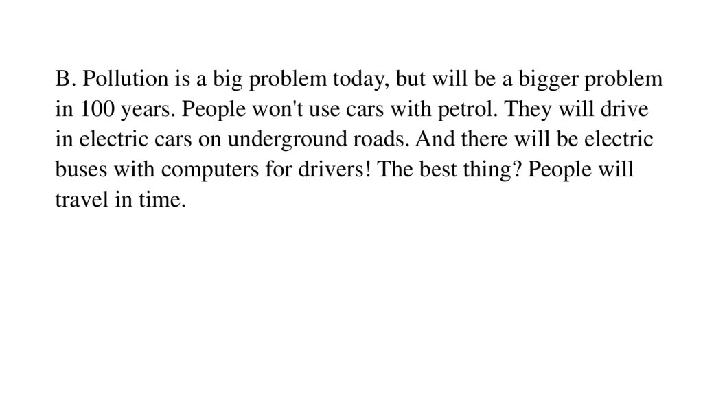 B. Pollution is a big problem today, but will be a bigger problemin 100 years. People won't use cars with petrol. They will drive