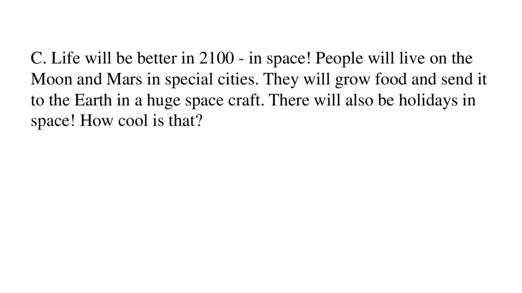 C. Life will be better in 2100 - in space! People will live on theMoon and Mars in special cities. They will grow food and send it