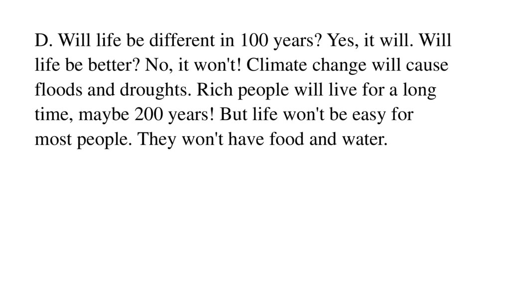 D. Will life be different in 100 years? Yes, it will. Willlife be better? No, it won't! Climate change will cause