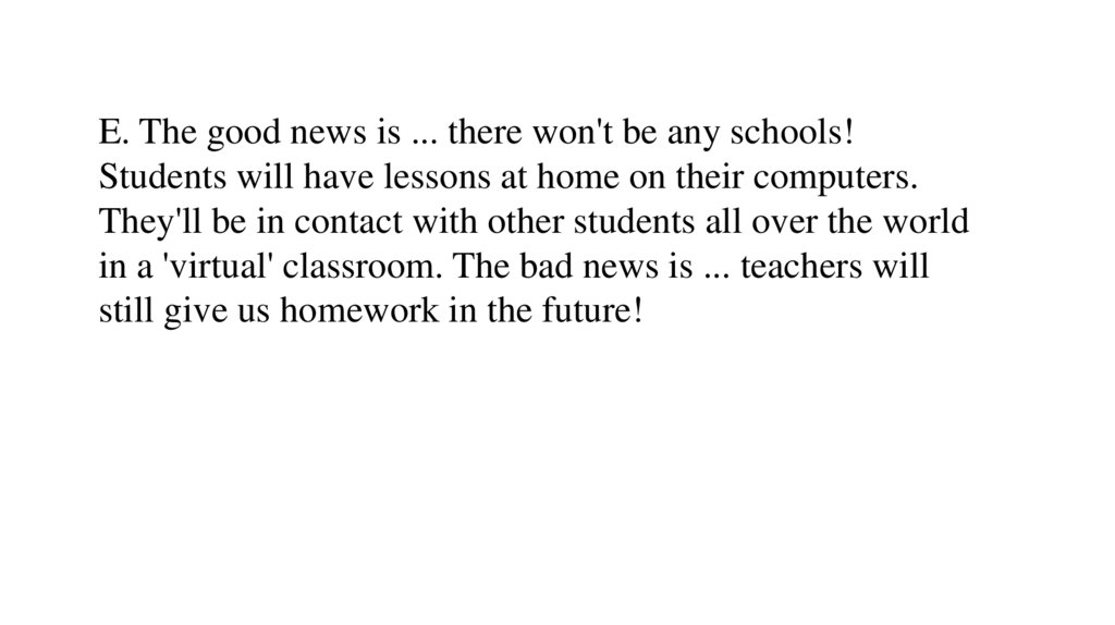 E. The good news is ... there won't be any schools!Students will have lessons at home on their computers.