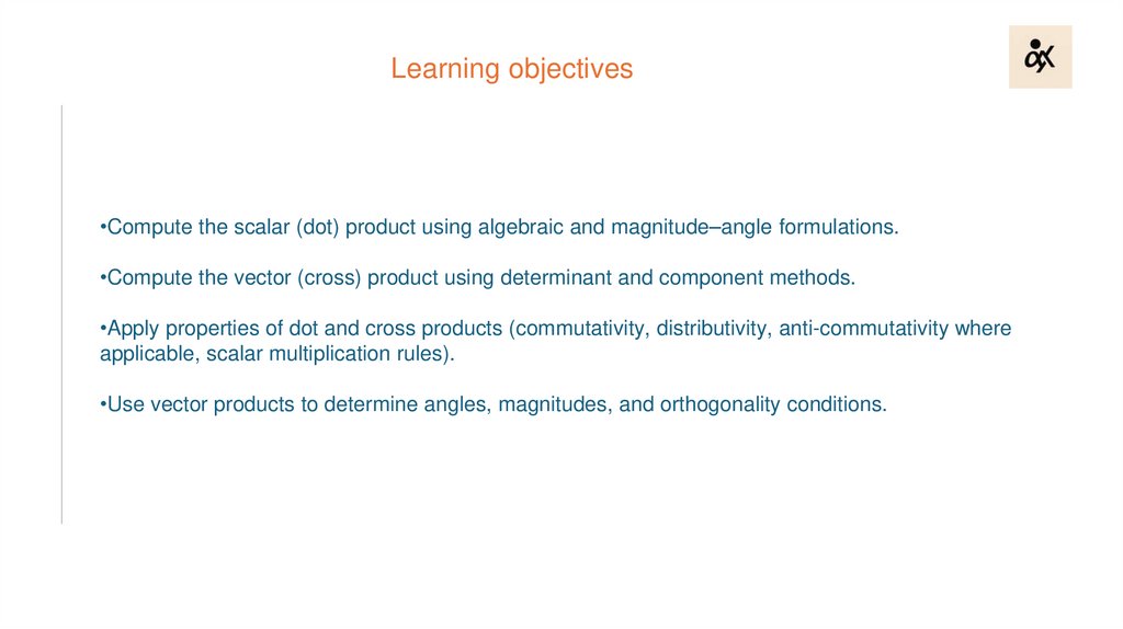 Learning objectives•Compute the scalar (dot) product using algebraic and magnitude–angle formulations.