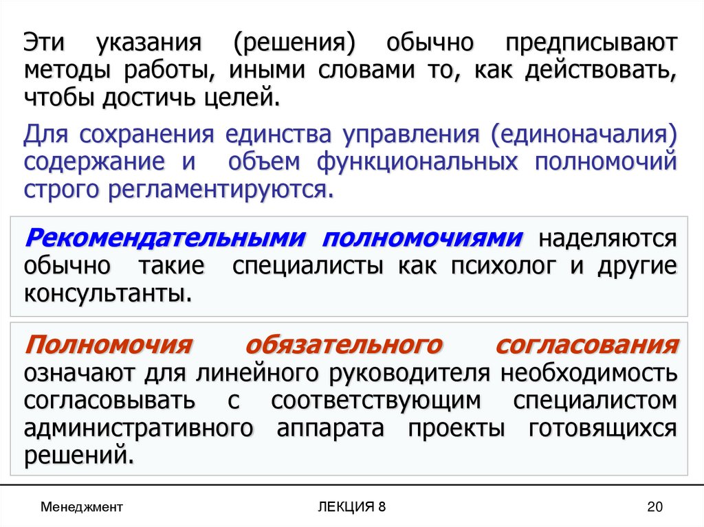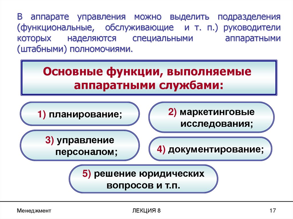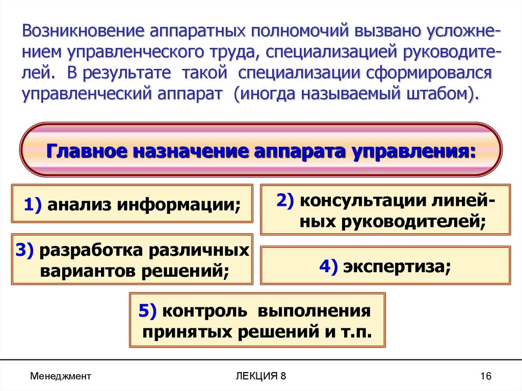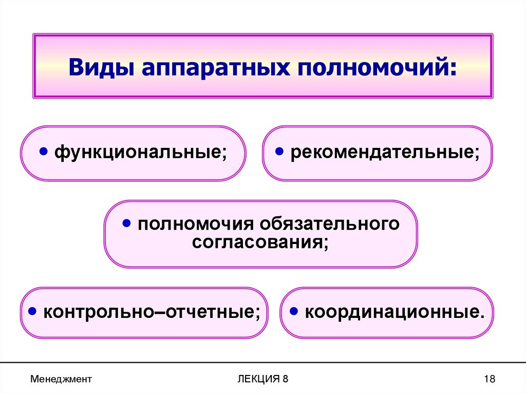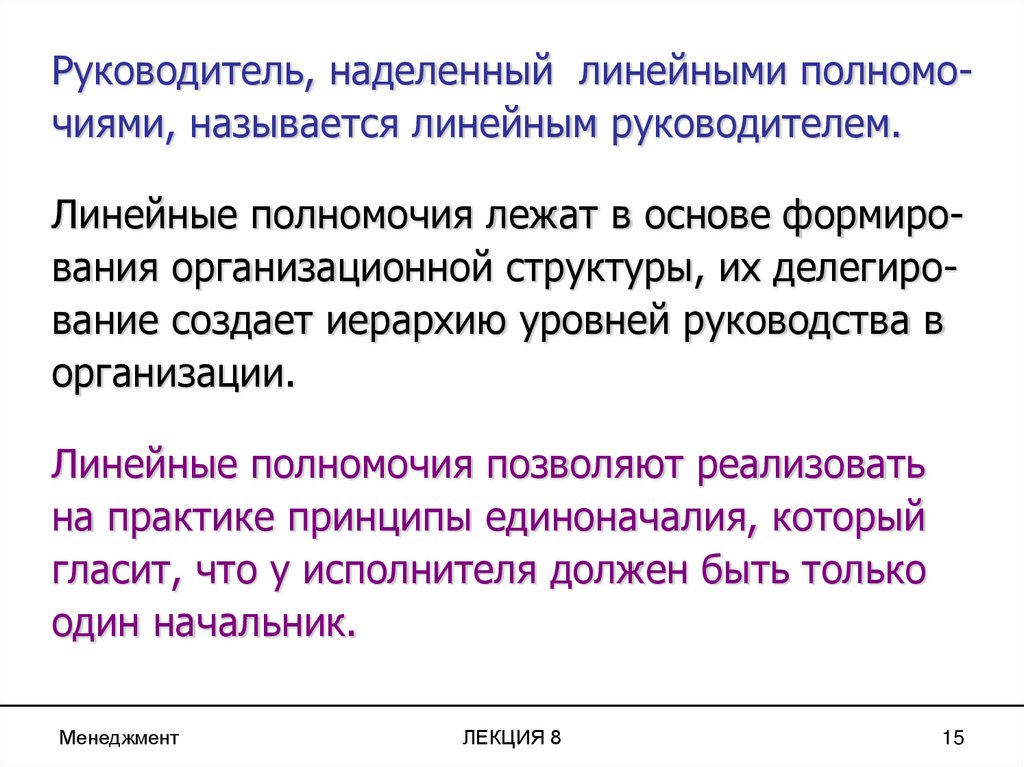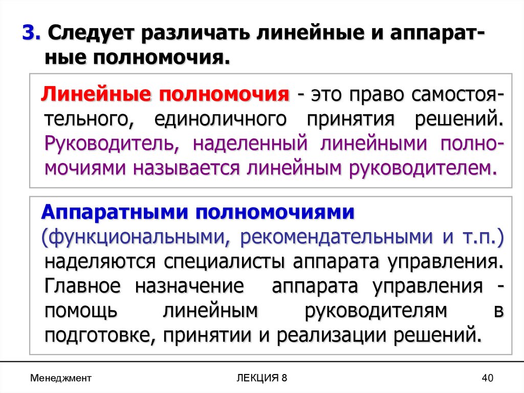 3. Следует различать линейные и аппаратные полномочия.Линейные полномочия - это право самостоятельного, единоличного принятия решений.