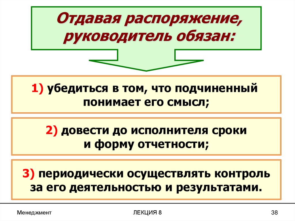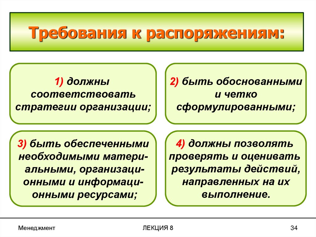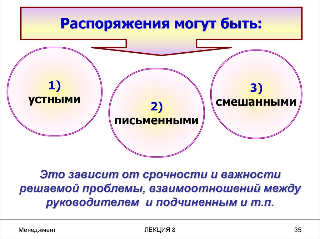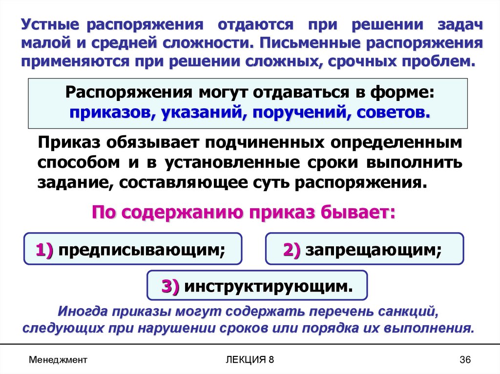 Устные распоряжения отдаются при решении задачмалой и средней сложности. Письменные распоряжения