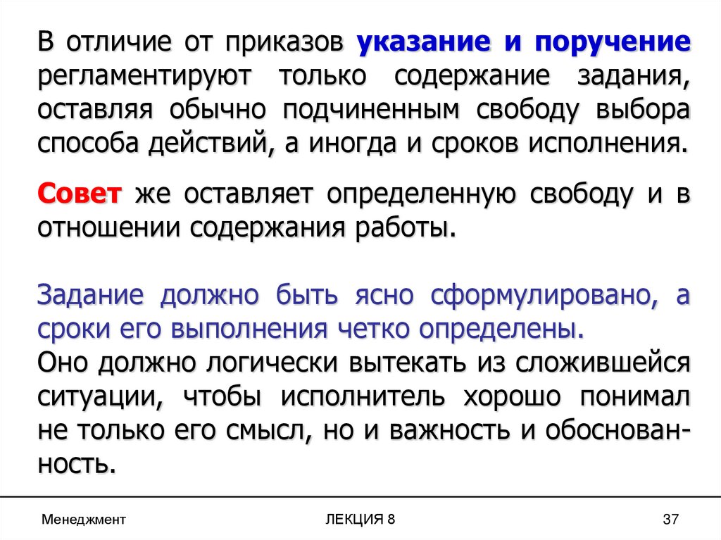 В отличие от приказов указание и поручениерегламентируют только содержание задания,