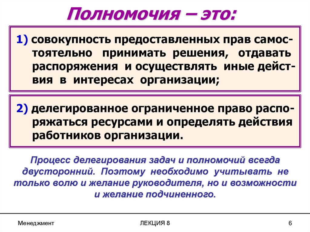 Полномочия – это:1) совокупность предоставленных прав самостоятельно принимать решения, отдавать