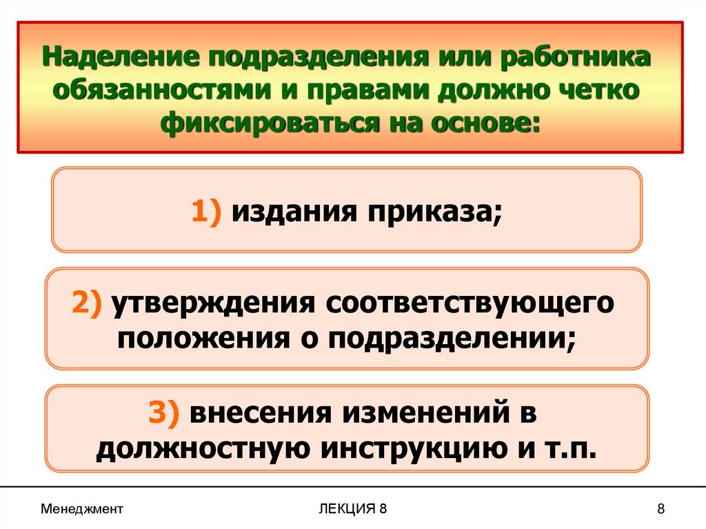 Наделение подразделения или работникаобязанностями и правами должно четко