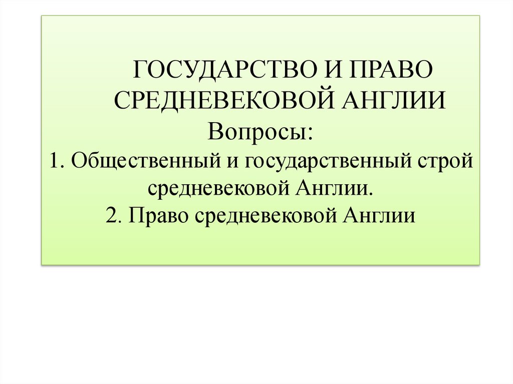 1. ГОСУДАРСТВО И ПРАВО СРЕДНЕВЕКОВОЙ АНГЛИИ Вопросы: 1. Общественный и государственный строй средневековой Англии. 2. Право