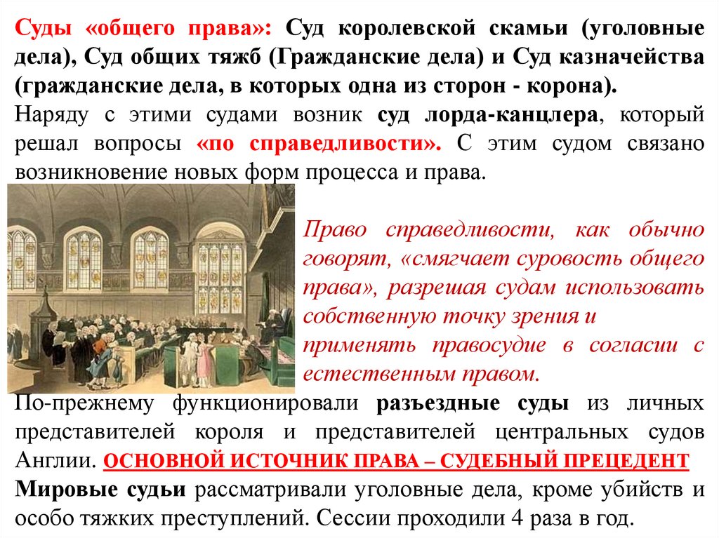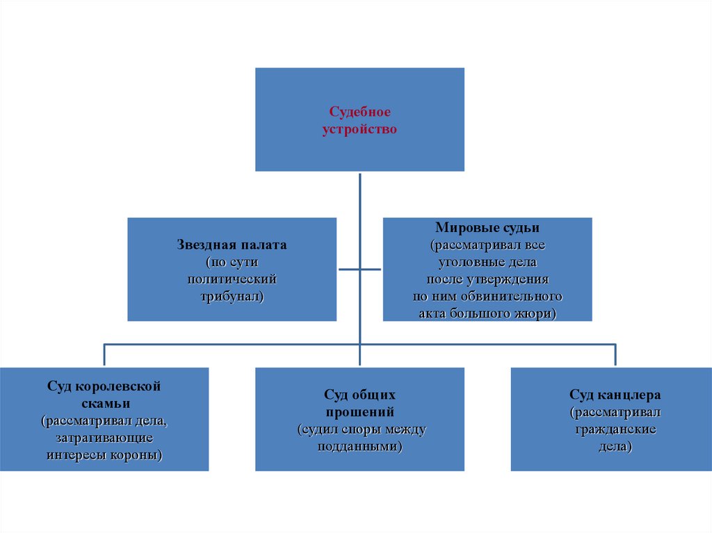 Суды «общего права»: Суд королевской скамьи (уголовныедела), Суд общих тяжб (Гражданские дела) и Суд казначейства