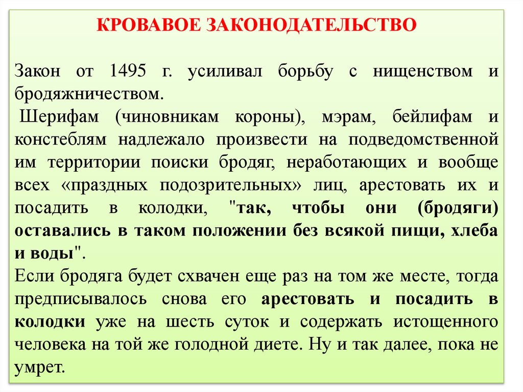 КРОВАВОЕ ЗАКОНОДАТЕЛЬСТВОЗакон от 1495 г. усиливал борьбу с нищенством и