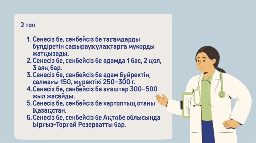 2. Сенесіз бе, сенбейсіз бе адамда 1 бас, 2 қол,