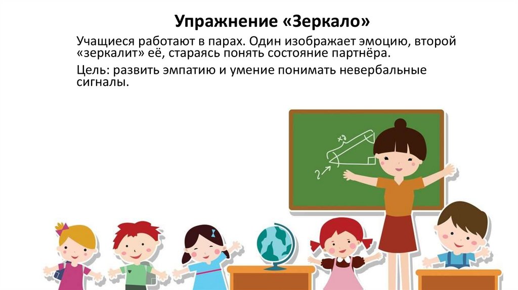 Упражнение «Зеркало»Учащиеся работают в парах. Один изображает эмоцию, второй