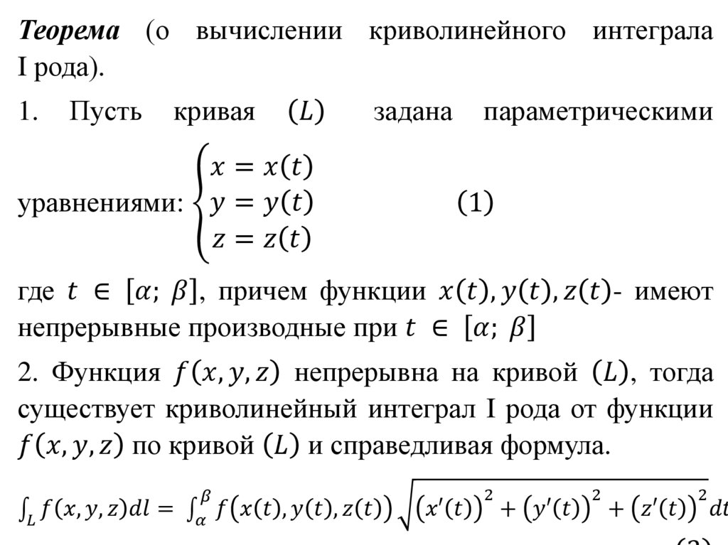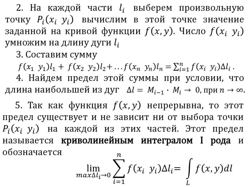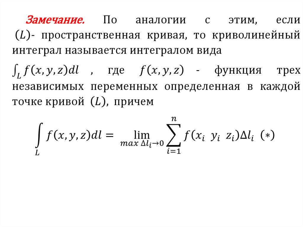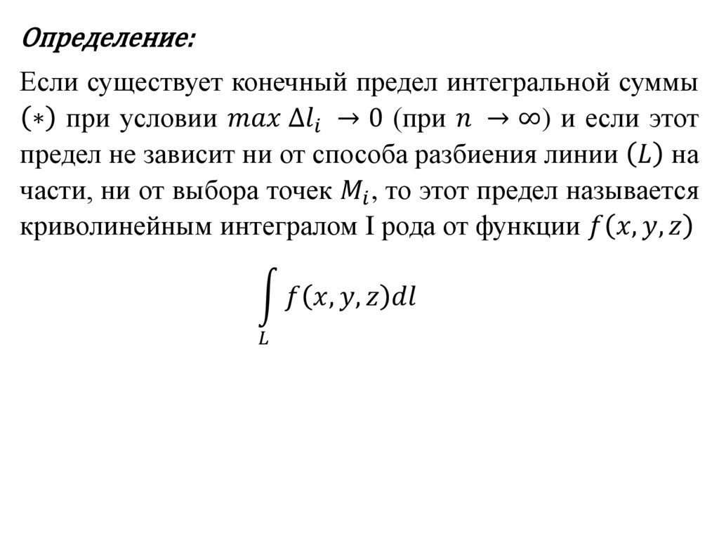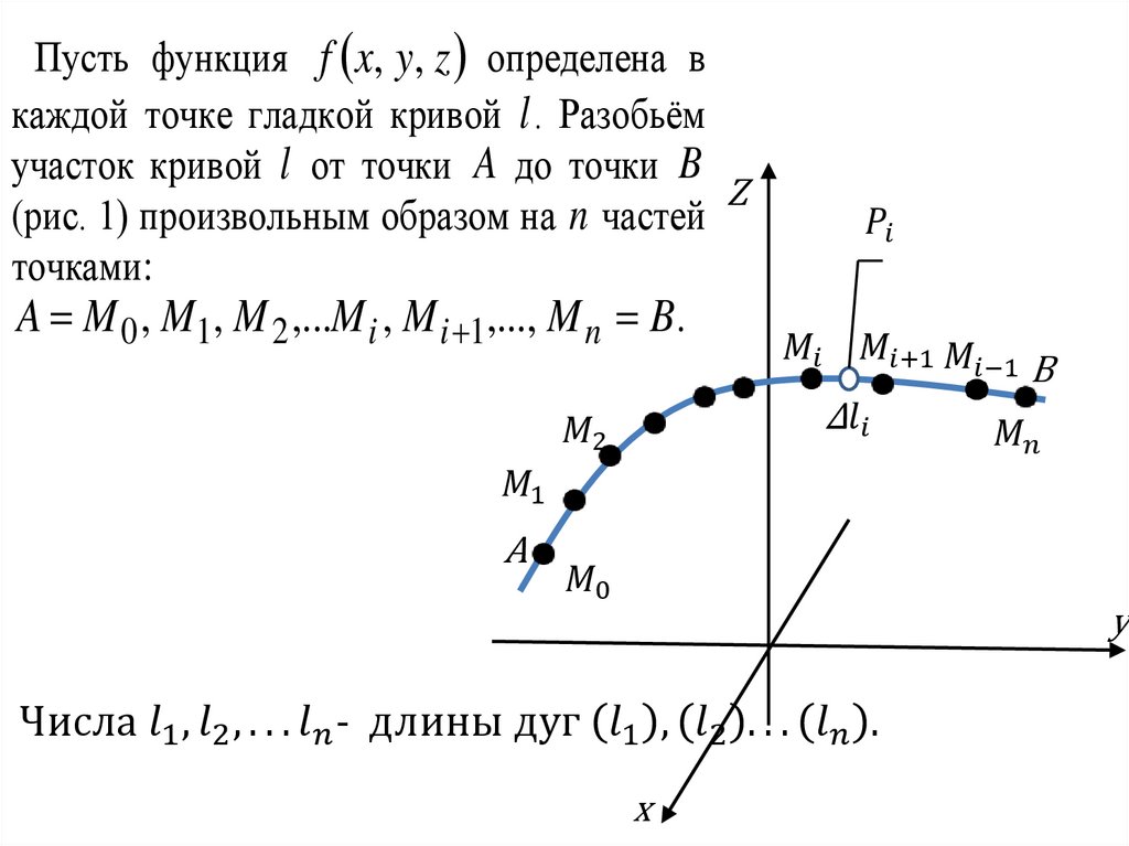 Пусть функция f x, y, z определена вкаждой точке гладкой кривой l . Разобьём