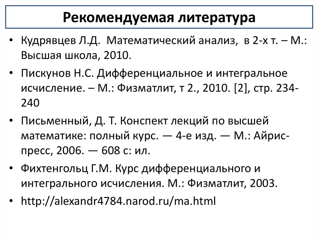 Рекомендуемая литература• Кудрявцев Л.Д. Математический анализ, в 2-х т. – М.:
