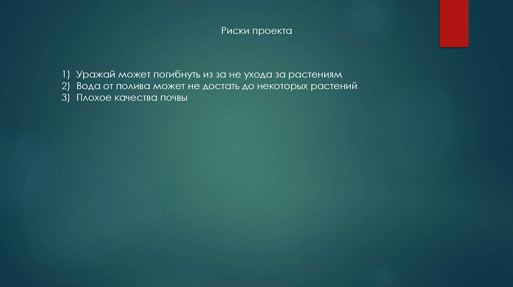 Риски проекта1) Уражай может погибнуть из за не ухода за растениям