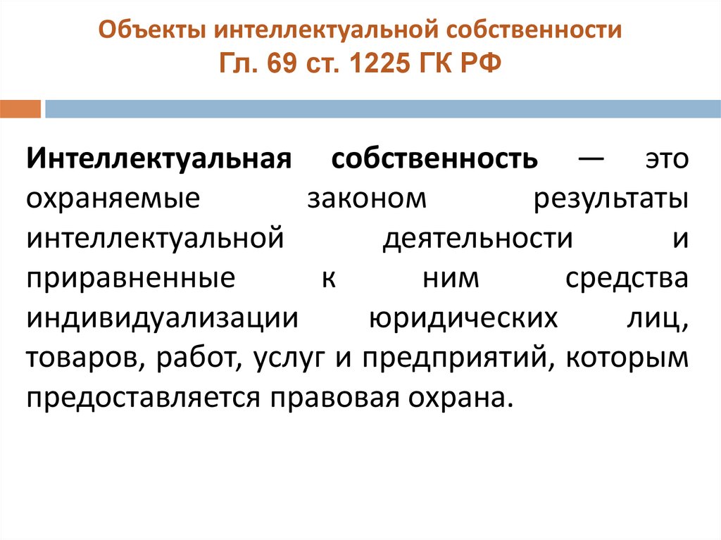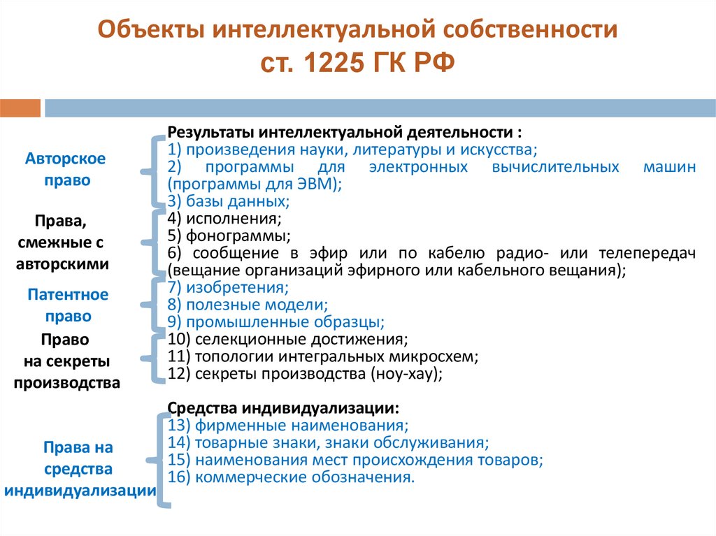 Объекты интеллектуальной собственностиГл. 69 ст. 1225 ГК РФ