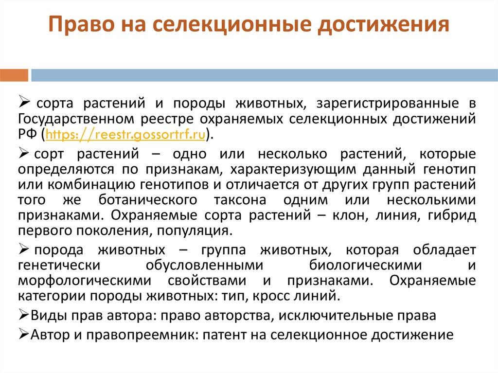 Право на селекционные достижениясорта растений и породы животных, зарегистрированные в