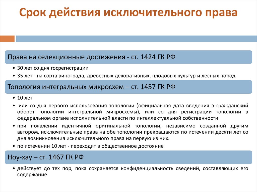 Срок действия исключительного праваПрава на селекционные достижения - ст. 1424 ГК РФ