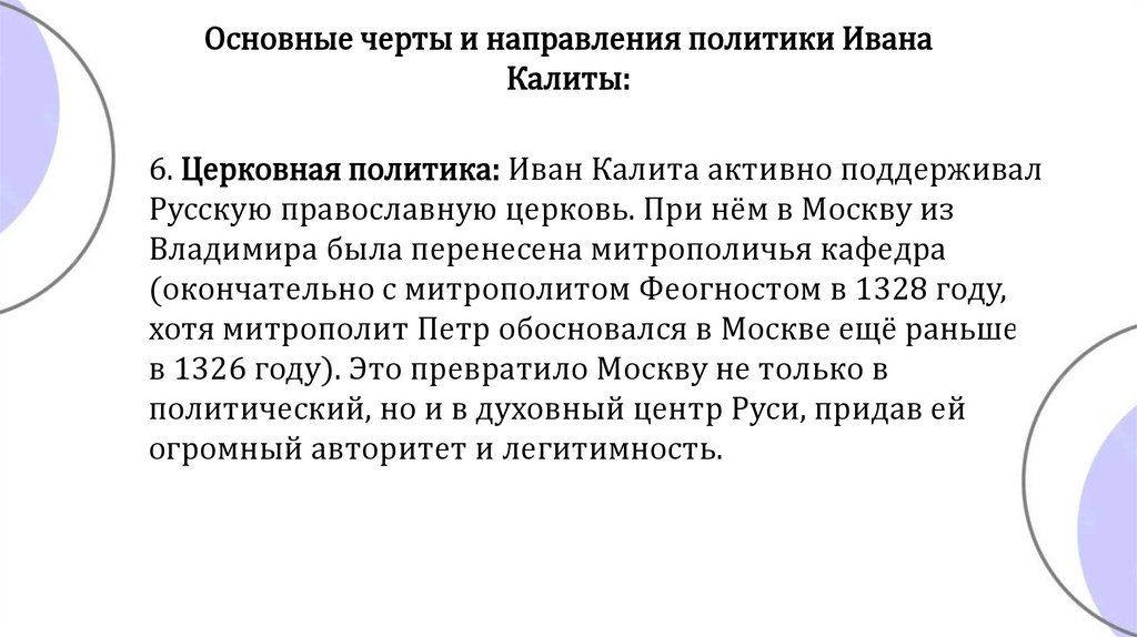 6. Церковная политика: Иван Калита активно поддерживал