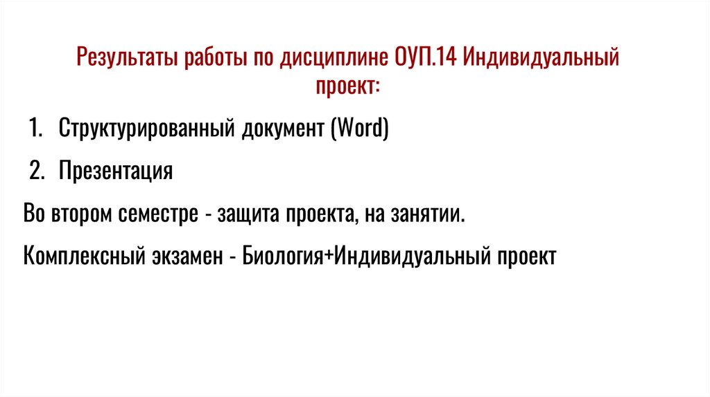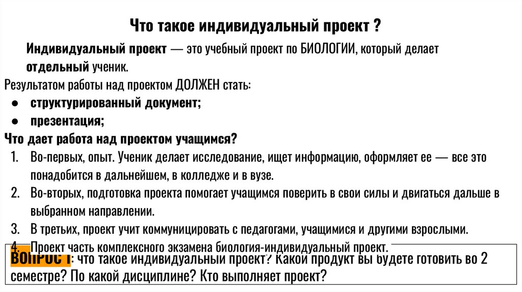 Что такое индивидуальный проект ?Индивидуальный проект — это учебный проект по БИОЛОГИИ, который делает