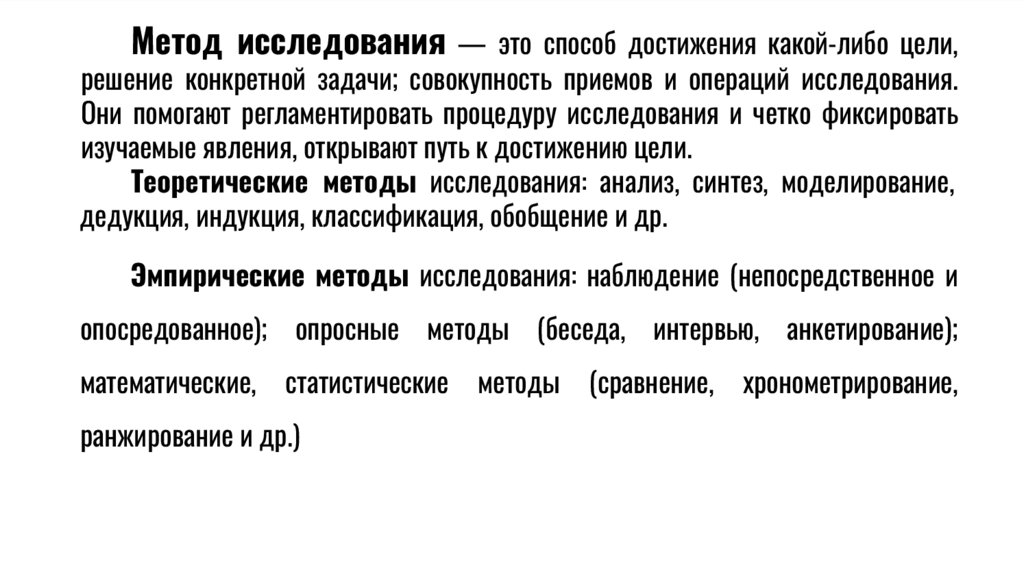 Метод исследования — это способ достижения какой-либо цели,решение конкретной задачи; совокупность приемов и операций исследования.
