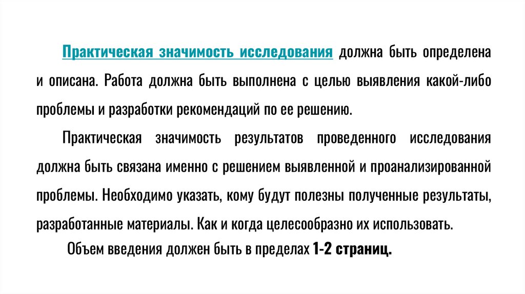Практическая значимость исследования должна быть определенаи описана. Работа должна быть выполнена с целью выявления какой-либо