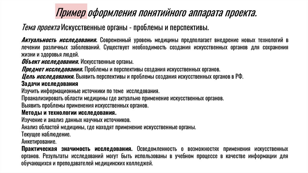 Пример oфopмлeния понятийного аппарата проекта.Тема проекта Искусственные органы - проблемы и перспективы.