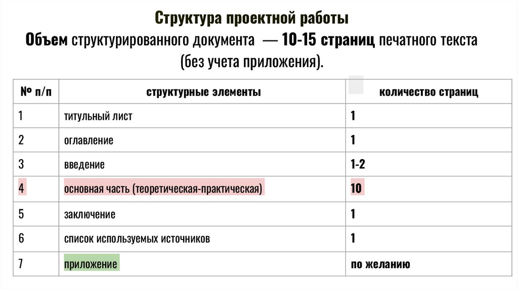 Структура проектной работыОбъем структурированного документа — 10-15 страниц печатного текста