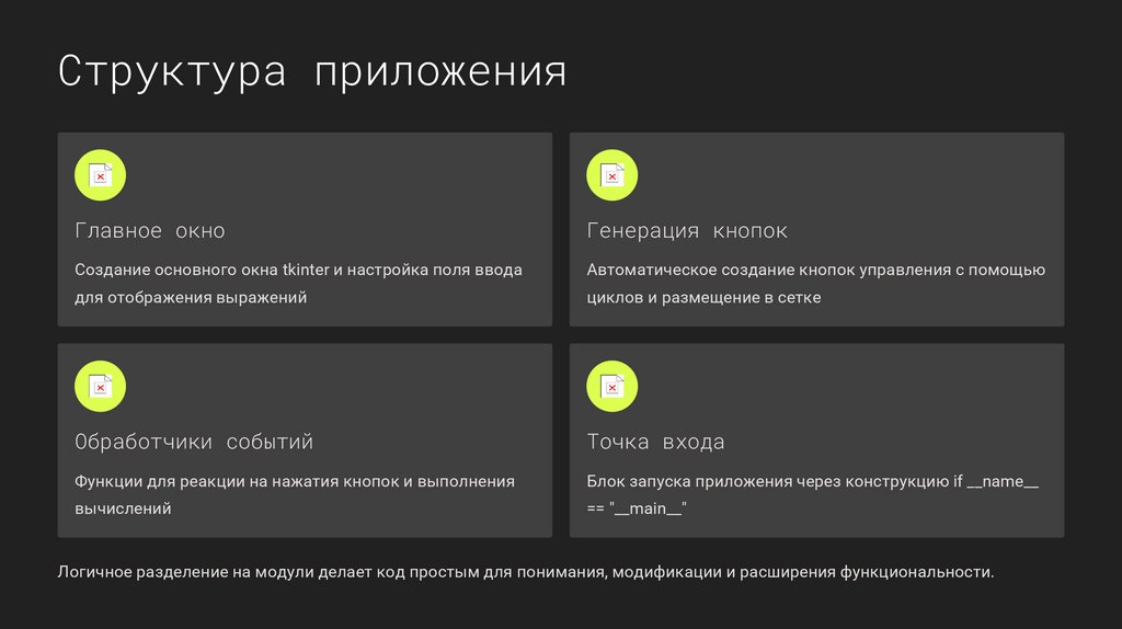 Логичное разделение на модули делает код простым для понимания, модификации и расширения функциональности.