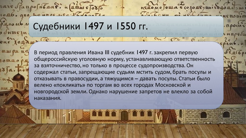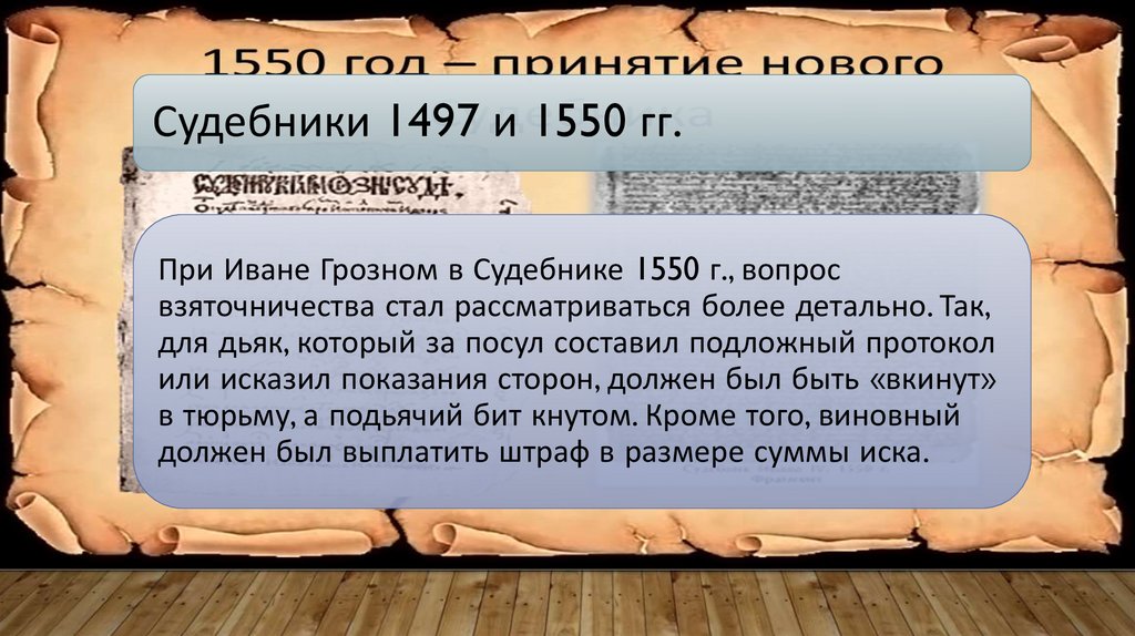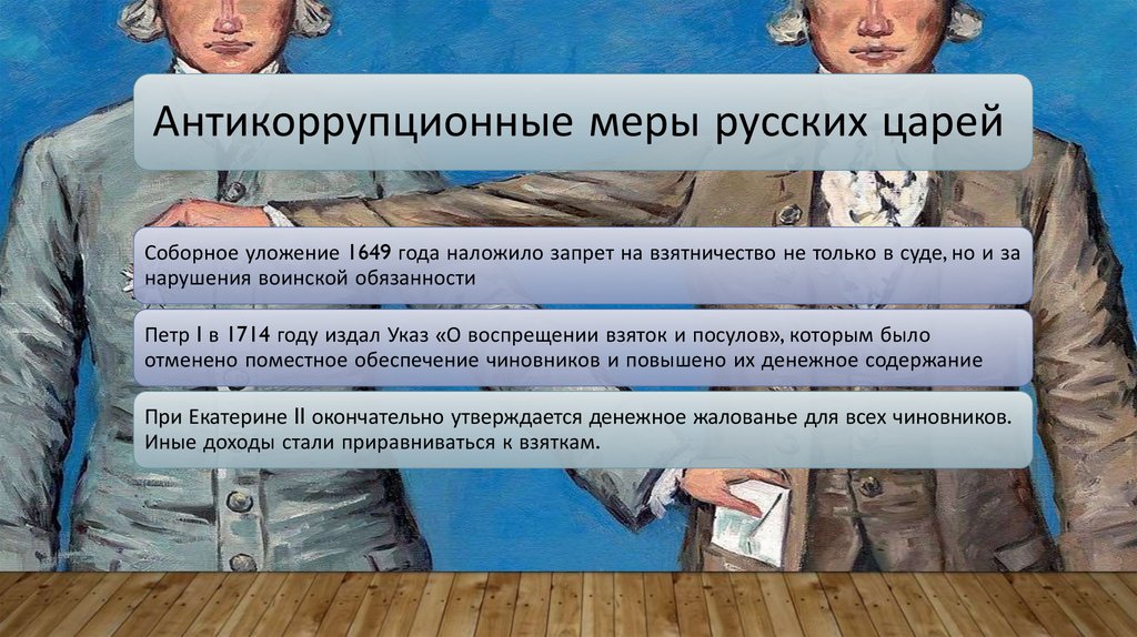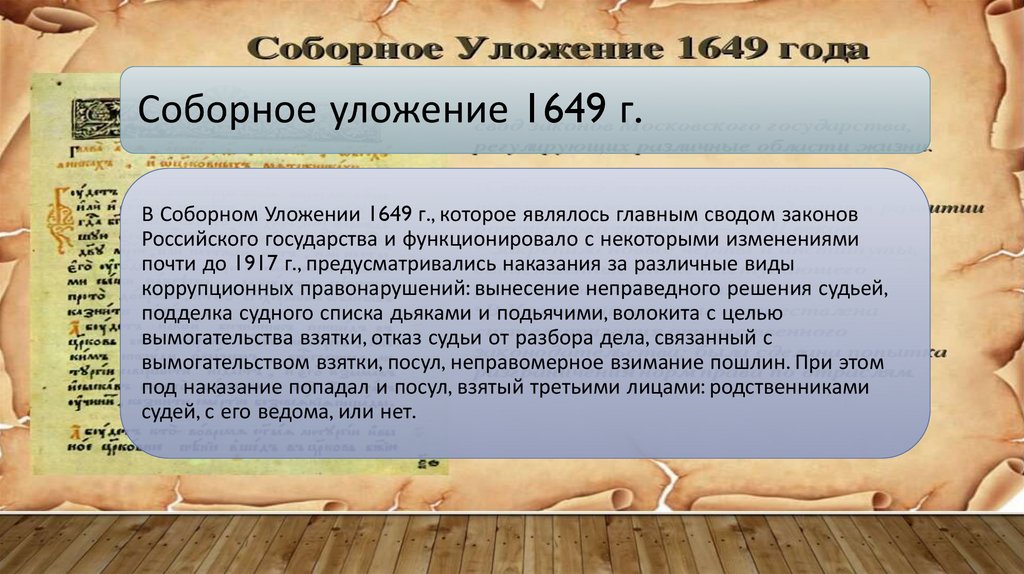 Антикоррупционные меры русских царейСоборное уложение 1649 года наложило запрет на взятничество не только в суде, но и за