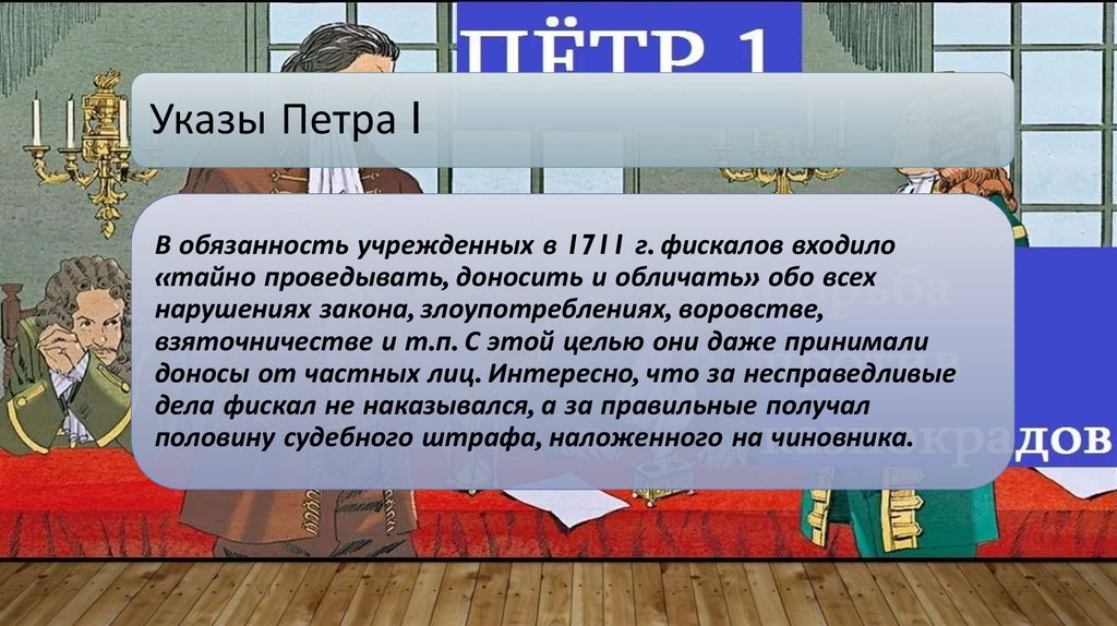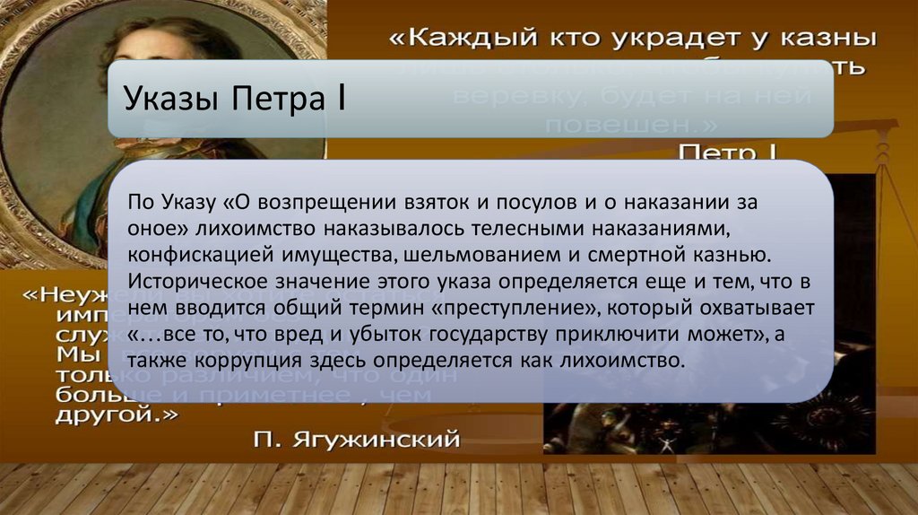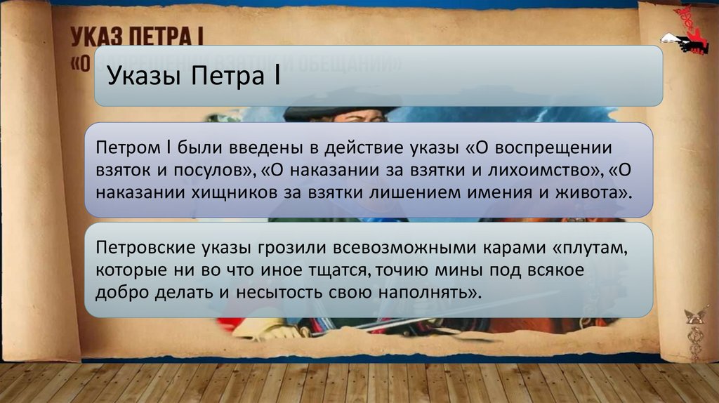 Петр I в 1714 году издал Указ «О воспрещении взяток и посулов», которым было