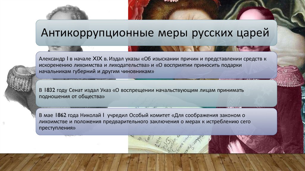Антикоррупционные меры русских царейАлександр I в начале XIX в. Издал указы «Об изыскании причин и представлении средств к