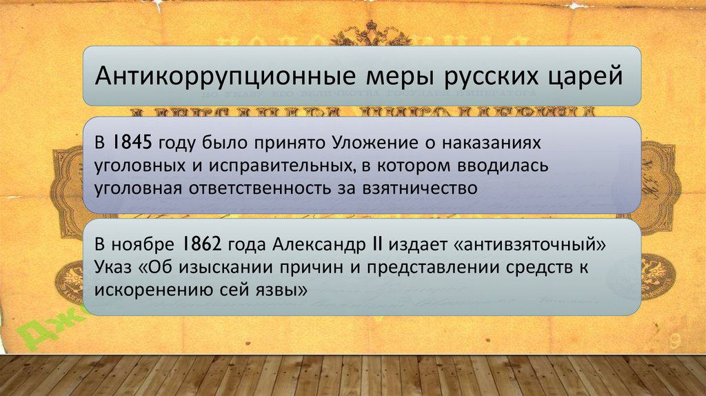 Антикоррупционные меры русских царейВ 1845 году было принято Уложение о наказаниях
