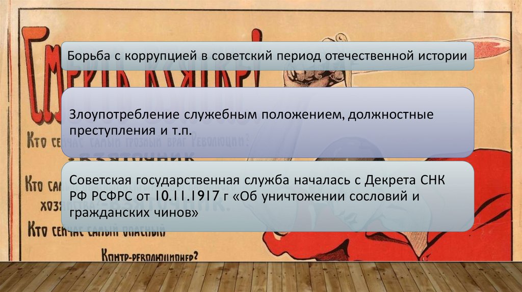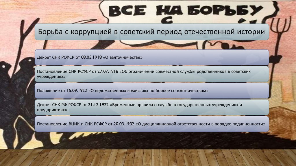 Борьба с коррупцией в советский период отечественной историиДекрет СНК РСФСР от 08.05.1918 «О взяточничестве»