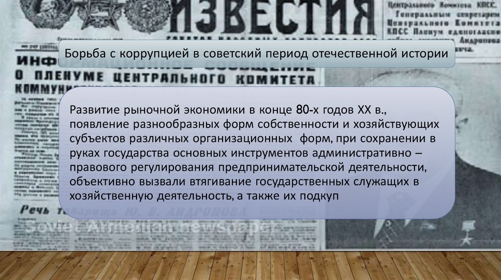 Борьба с коррупцией в советский период отечественной историиРазвитие рыночной экономики в конце 80-х годов ХХ в.,
