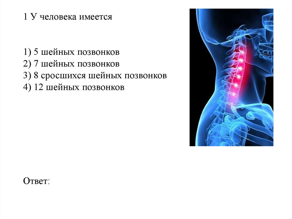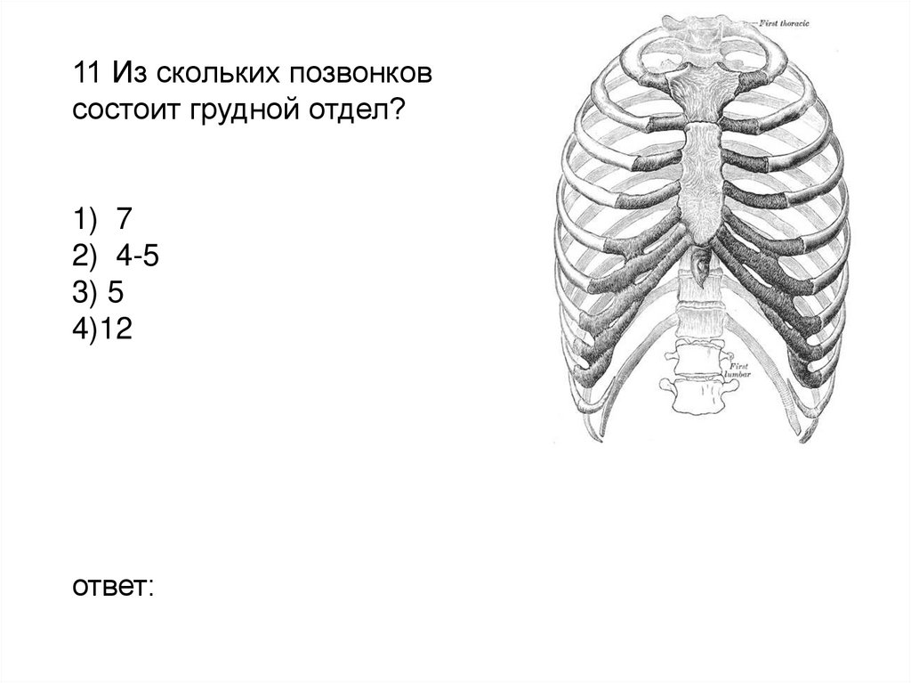 44. 22 Какой отдел позвоночника образован наименьшим числом позвонков? 1) поясничный 2) копчиковый 3) грудной 4) шейный Ответ: