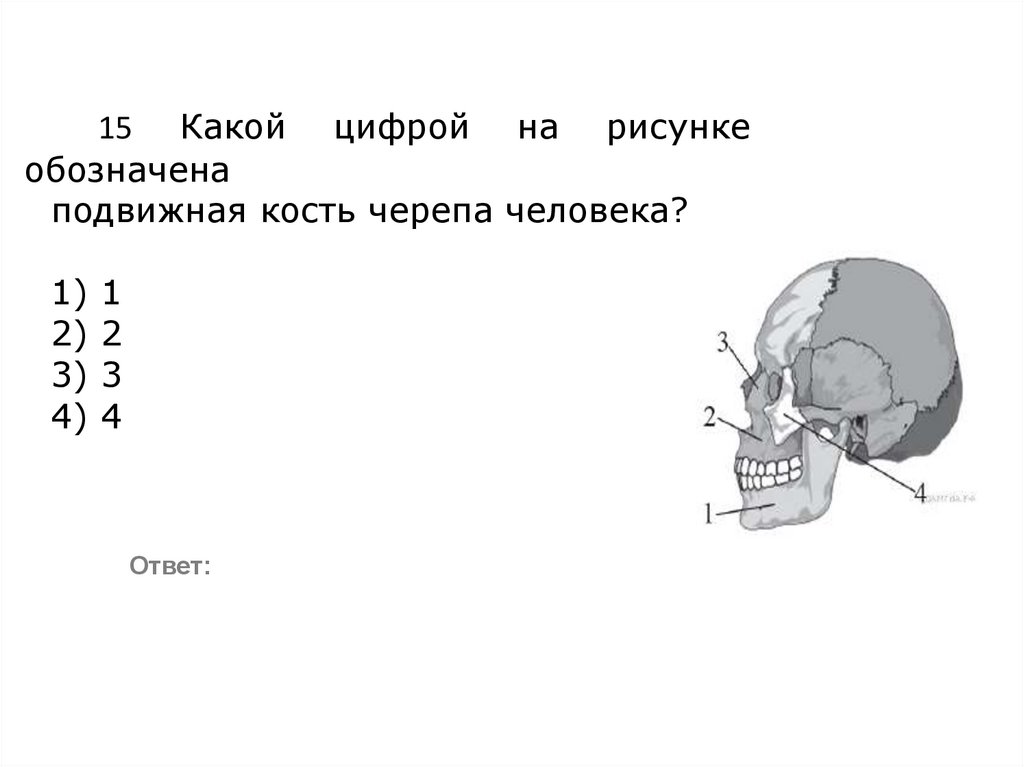 41. 19 Что НЕ входит в скелет мозгового отдела черепа? 1) нижнечелюстная кость 2) затылочная кость 3) височная кость 4) теменная
