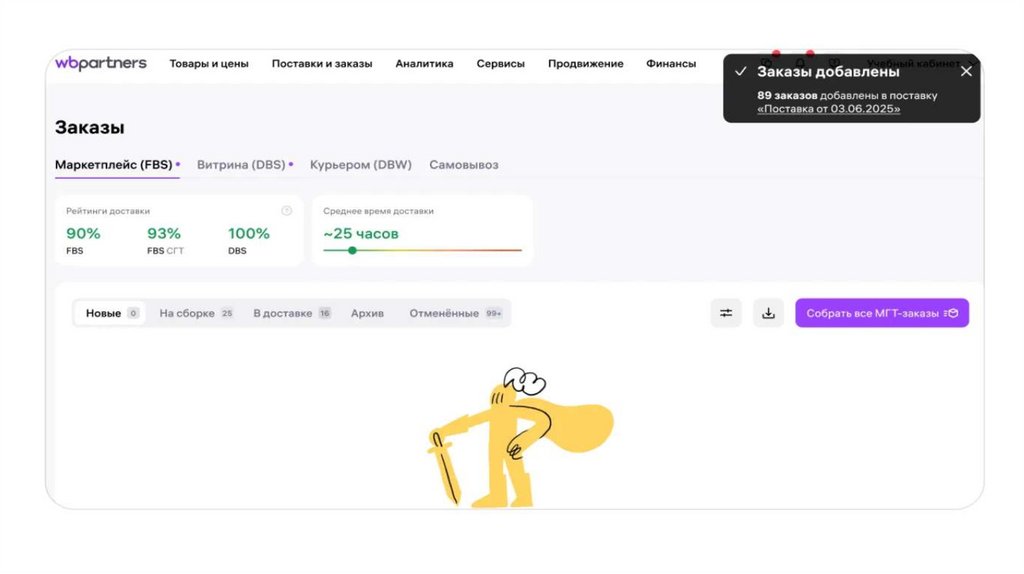 отслеживает заказы, собирает их, и сам отвозит