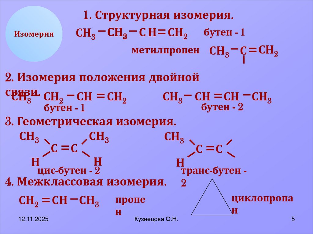 1. Структурная изомерия.СН3 СН32 С Н СН2 бутен - 1