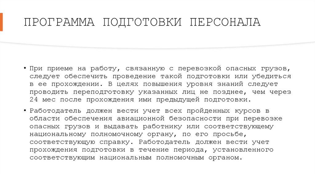 ПРОГРАММА ПОДГОТОВКИ ПЕРСОНАЛА• При приеме на работу, связанную с перевозкой опасных грузов,