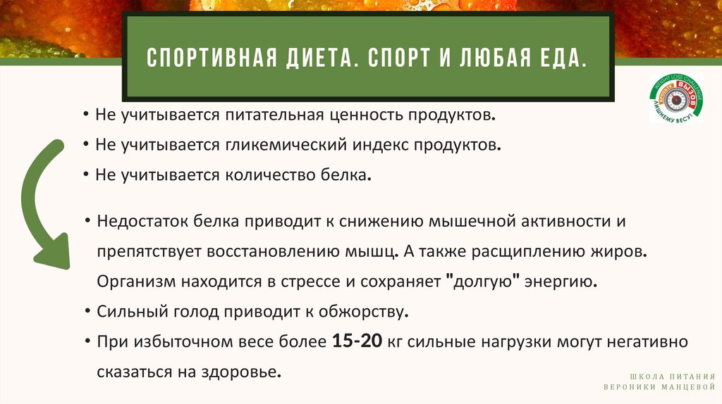 СПОРТИВНАЯ ДИЕТА. СПОРТ И ЛЮБАЯ ЕДА.• Не учитывается питательная ценность продуктов.